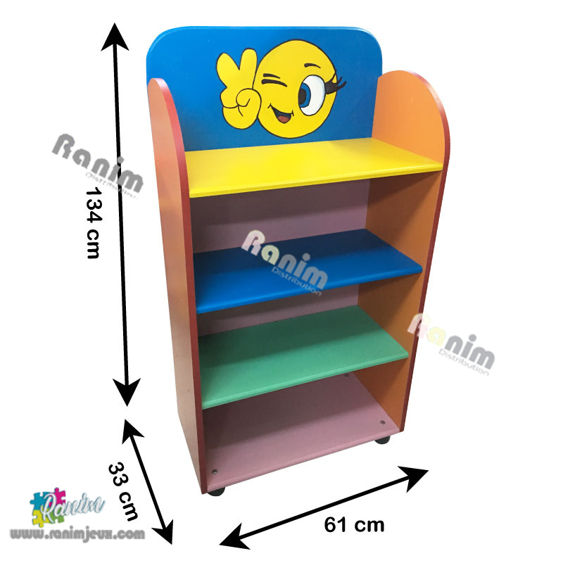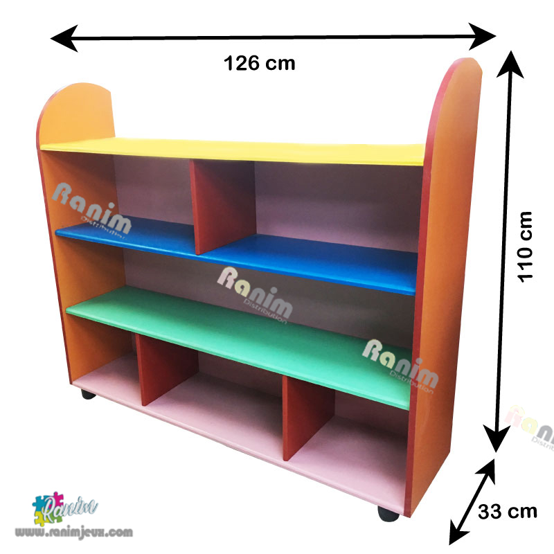 Étagère en bois Multi couleur. Elle peut être équipée avec des roues pour un déplacement plus facile.