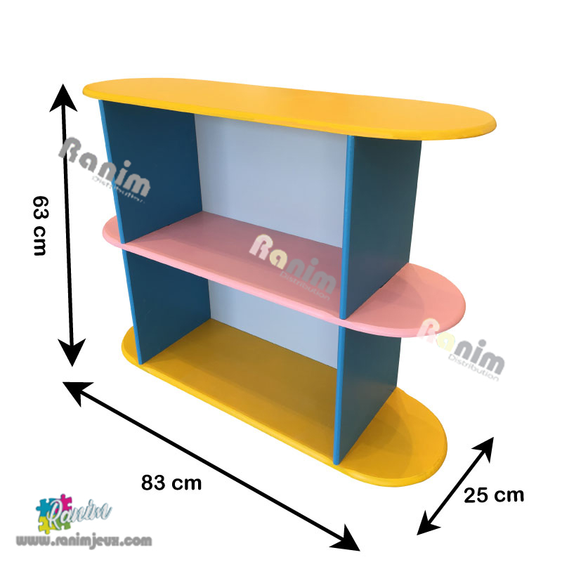 Étagère livre en bois Multi-couleurs. Elle est répartie en quatre étages verticale pour le rangement des livres et comptes.