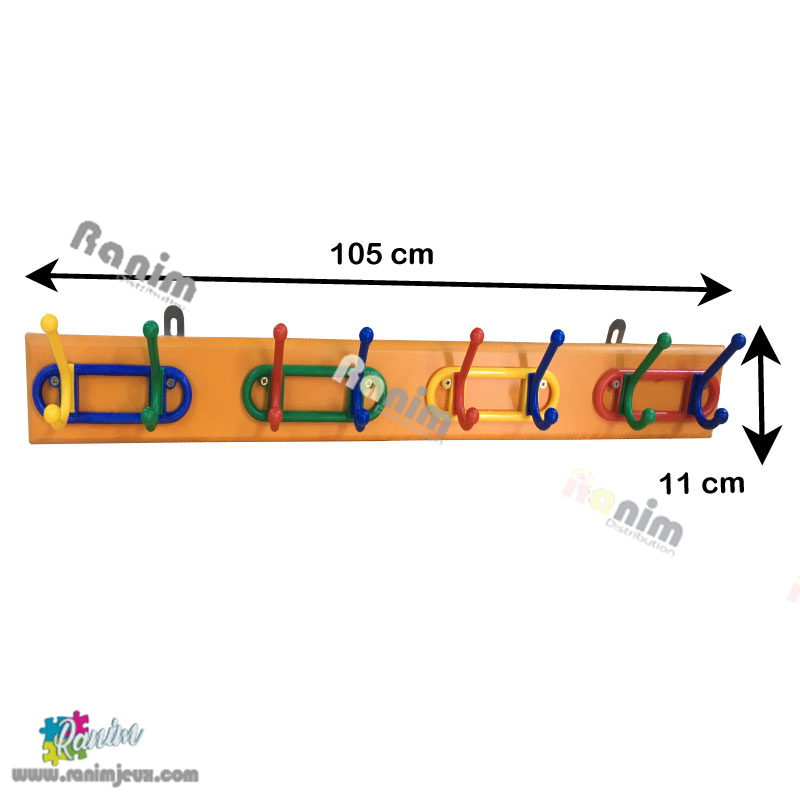 Porte manteaux mural en bois avec 8 crochets en plastique Multi couleur.